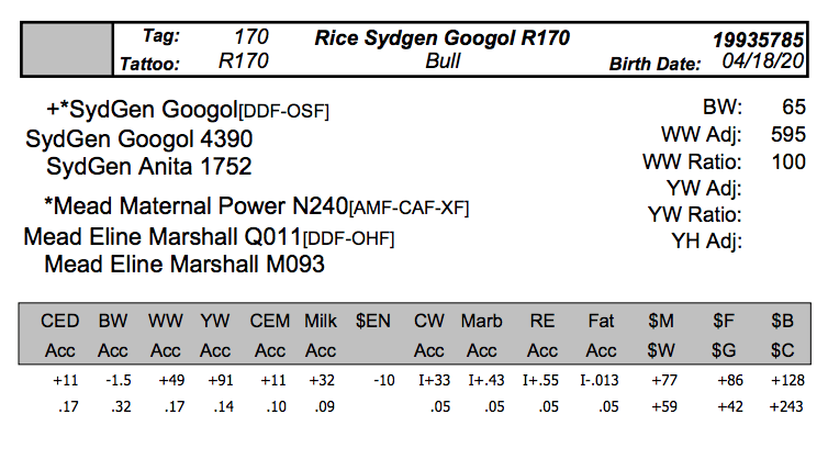 Rice Sydgen Googol R170 is a top of the line sire featuring a calving ease direct of 11. Additionally, he has a yearling weight EPD of 91. This bull takes Sydenstricker Angus and Mead Farm’s Genetics to create an optimal well tempered Bull with emphasis on Calving ease. $3,400 Sold
