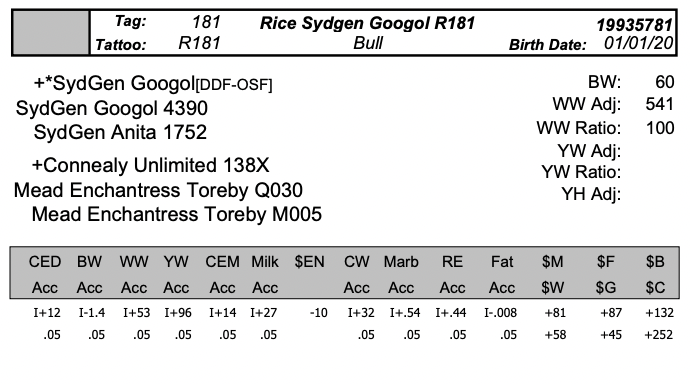 Rice Sydgen Googol R181 is a top of the line Sire featuring a Calving Ease Direct of I+12. Additionally, he has a Yearling weight EPD of I+96. This Bull Takes Sydenstricker Angus and Mead Farm’s Genetics to create an optimal quality Bull. $3500 sold