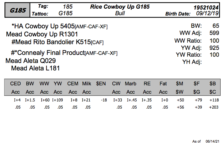 528 has an excellent yearling weight EPD of I+109. He also has a calving ease direct of I+4. His father, Mead Cowboy up, is a Premium bull for calving ease. Rice Cowboy Up G185 was bread for Yearling weight while maintaining a good calving ease. $2500 sold