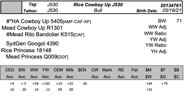 Rice Cowboy Up J530 is a quality Heifer and Herd Bull. With a Calving Ease Direct of 9 and a Calving Ease Maternal of 10 he should provide more than adequate calving ease. Additionally he features a triple digit yearling weight EPD of 103.