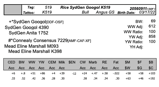 Rice Sydgen Googol K519 features a calving ease direct of +6 and a $C value of +192. He is the son of the sire SydGen Googol from sydenstricker genetics and from Mead Eline Marshall of Mead farms. He is a great looking bull with much potential. $2500-Sold