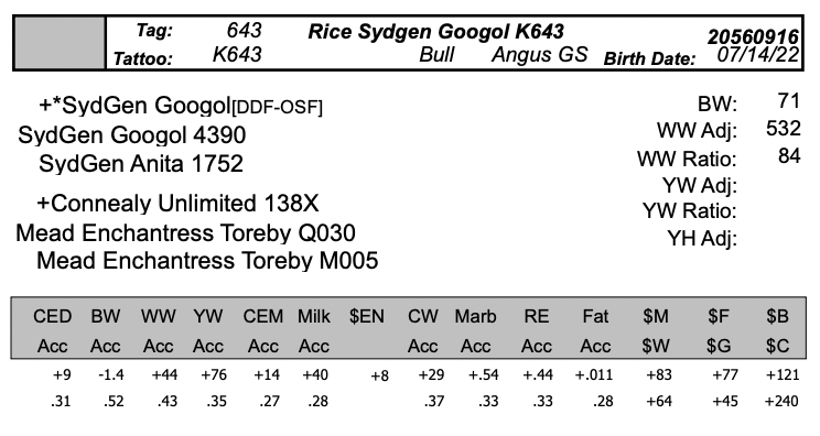 Rice Sydgen Googol K643 is a top quality Bull with a Calving Ease Direct of +9 and a Calving ease Maternal of +14. He is the son of Sydgen Googol 4390 and Mead Enchantress Toreby Q030. Sold