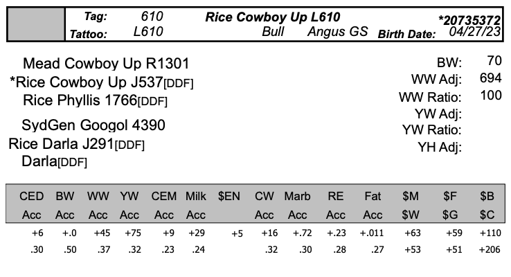Rice Cowboy Up L160 is an excellent bull featuring a Calving Ease Direct of +6 and a Calving Ease Maternal of +9. He is of the Cowboy Up and Sydgen Googol lines. He has both great calving ease and marbling. Sold